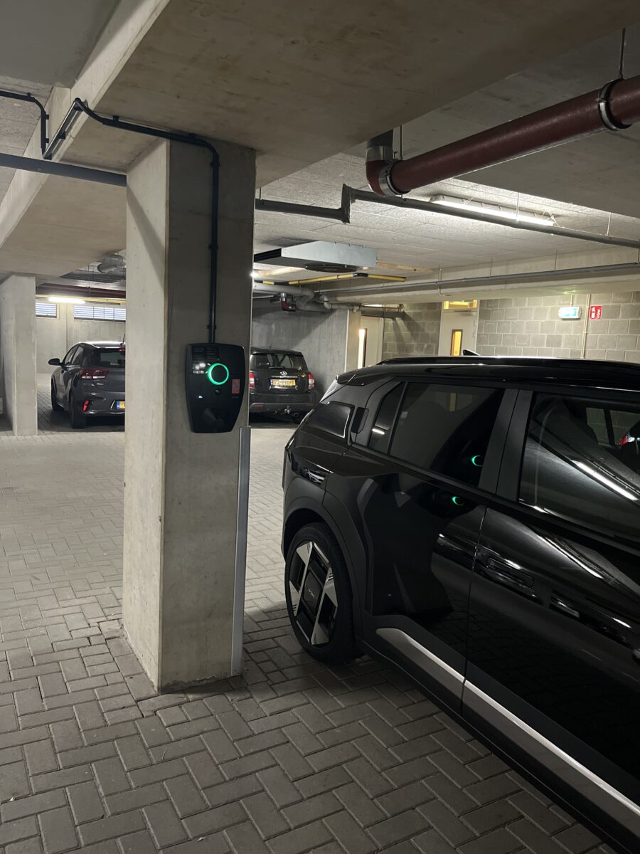 Direct zijn 4 Zaptec Pro laadpunten aangesloten op de eigen parkeerplaatsen van de bewoners met load balancing over alle actieve punten.